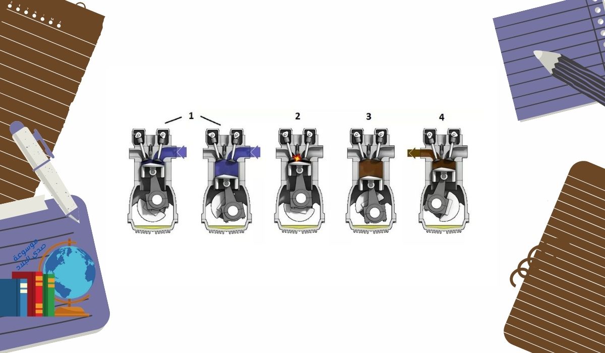 في الصورة خطوات تشغيل محرك الاحتراق الداخلي رباعي الأشواط. الأشواط هي كما يلي: